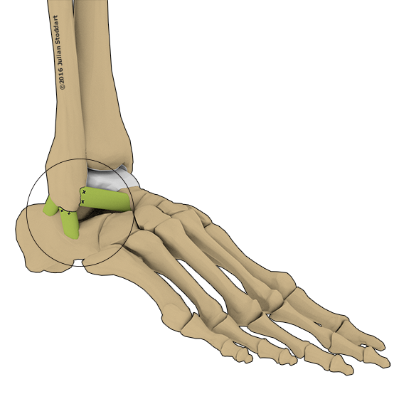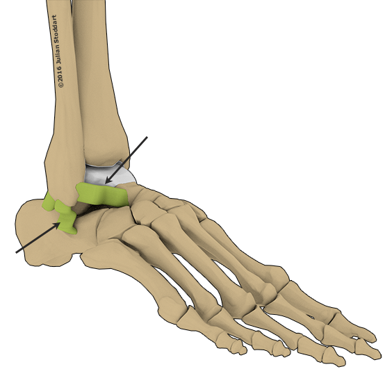 The ligaments on the outside of the ankle (arrowed) can be stretched with ankle sprains. This leads to a feeling of ankle instability.