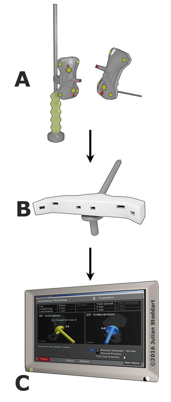 Computer navigation is a technique to help improve the accuracy of the position of the hip replacement. It also provides a very accurate means of measuring leg length. An Infrared tracker is attached to the pelvis and a computer map of the hip is generated. Another tracker is attached to various instruments. The computer is then used to help the surgeon prepare the bone and position the hip components accurately.