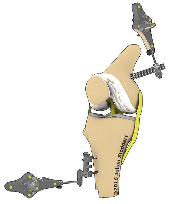This diagram shows one tracker attached to the femur (thigh bone) and the other to the tibia (the shin bone)